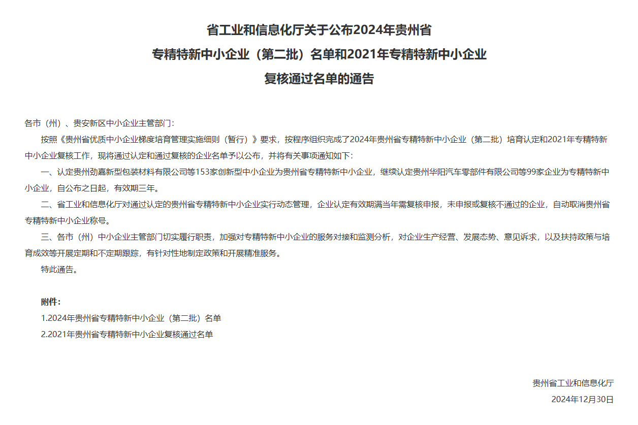 贵州www.kaiyun.com有限公司荣誉2024年获得国家科技部认定“国家高新技术企业”、贵州省科技厅认定“科技型中小企业”、贵州省工业和信息化厅认定“贵州省专精特新企业”、“创新型中小企业”。